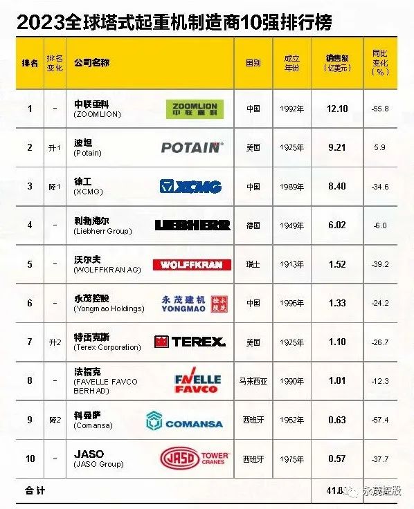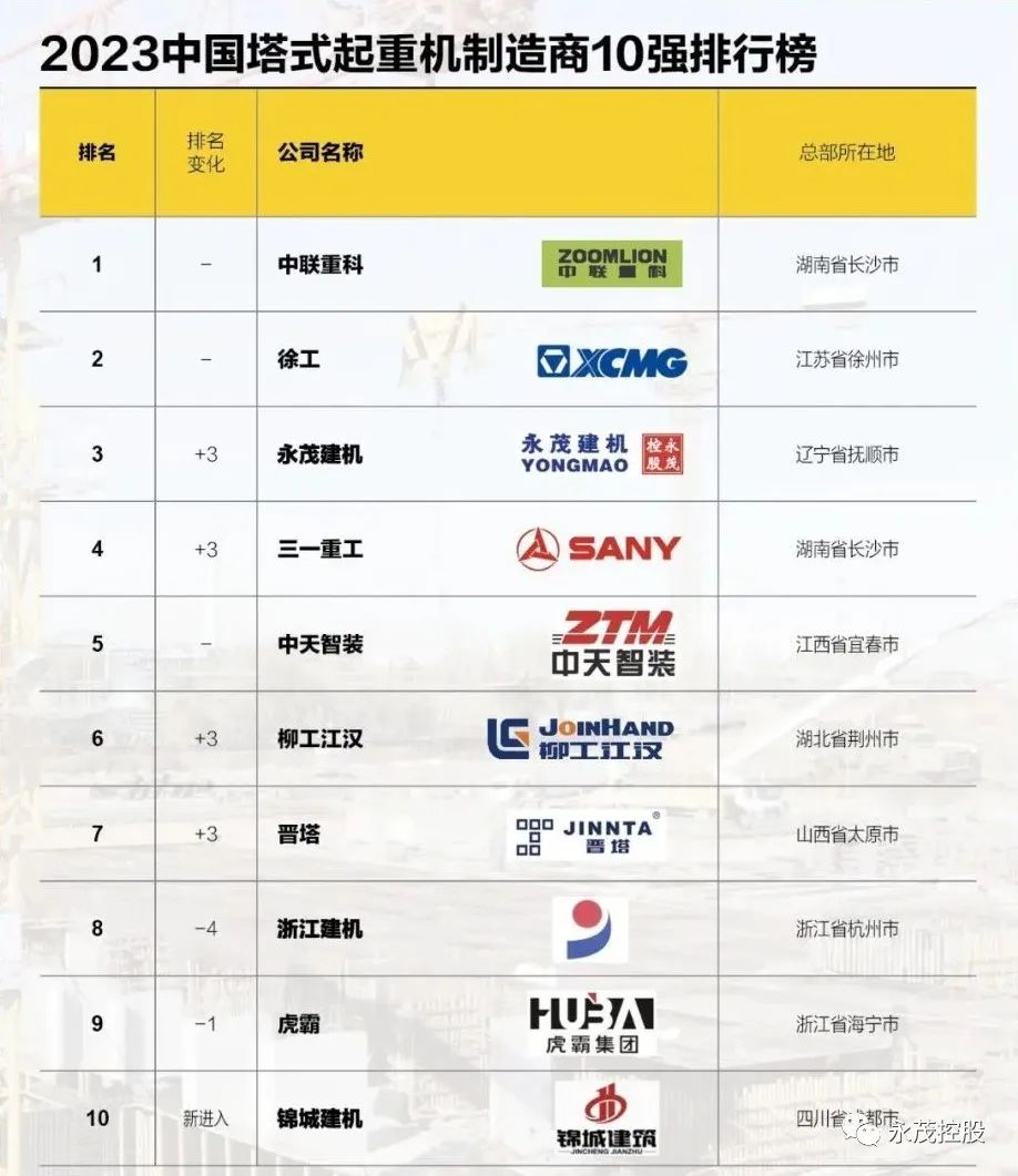 近日,2023全球塔式起重機(jī)制造商10強(qiáng)排行榜正式發(fā)布。本屆榜單由ERC《設(shè)備租賃與施工》與CCM《中國(guó)工程機(jī)械》雜志聯(lián)合發(fā)布。永茂建機(jī)再次入選2023全球塔式起重機(jī)制造商10強(qiáng)榜單,這也是永茂自2013年起連續(xù)十一年入選該榜單,2023年排名位居全球塔機(jī)制造商第六位。相比上屆榜單,本屆排行榜的入榜企業(yè)構(gòu)成未發(fā)生變化。美國(guó)企業(yè)馬尼托瓦克-波坦、特雷克斯,德國(guó)企業(yè)利勃海爾,瑞士企業(yè)沃爾夫,馬來(lái)西亞企業(yè)法?、以及西班牙企業(yè)科曼薩和JASO再度入榜;中聯(lián)重科、徐工、永茂控股三家中國(guó)企業(yè)實(shí)力入榜。
